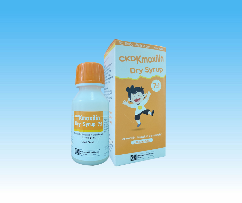 CKDKmoxilin Dry Syrup là thuốc kê đơn, thuốc kháng sinh. Sự kết hợp của Amoxillin và Kali Clavulanat theo tỷ lệ 7: 1 trong thuốc có tác dụng điều trị các trường hợp nhiễm khuẩn hô hấp trên, hô hấp dưới, nhiễm khuẩn tiết niệu-sinh dục, nhiễm khuẩn da, mô mềm.
